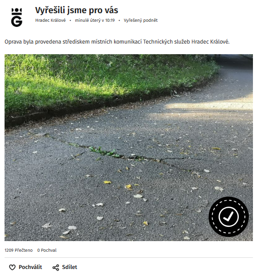 Díky MUNIPOLIS tak mají obyvatelé Hradce Králové jednoduchý a rychlý způsob, jak přispět k lepšímu fungování města, a město zase možnost efektivně reagovat na potřeby svých občanů. Článek si můžete přečíst na portálu Hradecká Drbna nebo se podívat na skvěle zvládnuté řešení podnětů přímo na profilu města Hradec Králové v MUNIPOLIS.